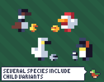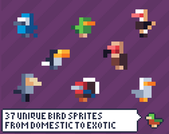 37 unique 4 directional bird sprites for your next farming, platformer, match 3, or virtual pet game.